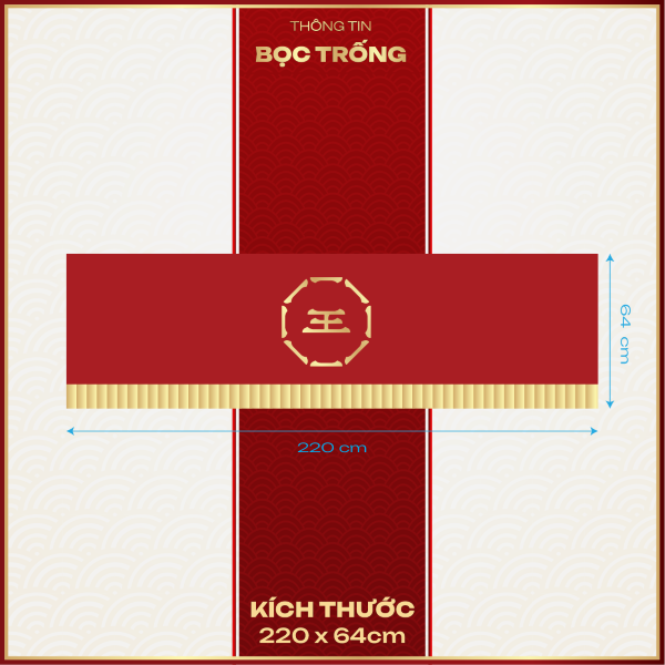 Kích thước tiêu chuẩn 62 x 220 cm, phù hợp với các loại trống từ 5 đến 6 tấc. Form thiết kế ôm vừa, giúp giữ trống chắc chắn trong khi biểu diễn. Phần viền dưới được xếp ly bằng vải kim tuyến cao cấp, tạo điểm nhấn sang trọng và lấp lánh khi chuyển động.