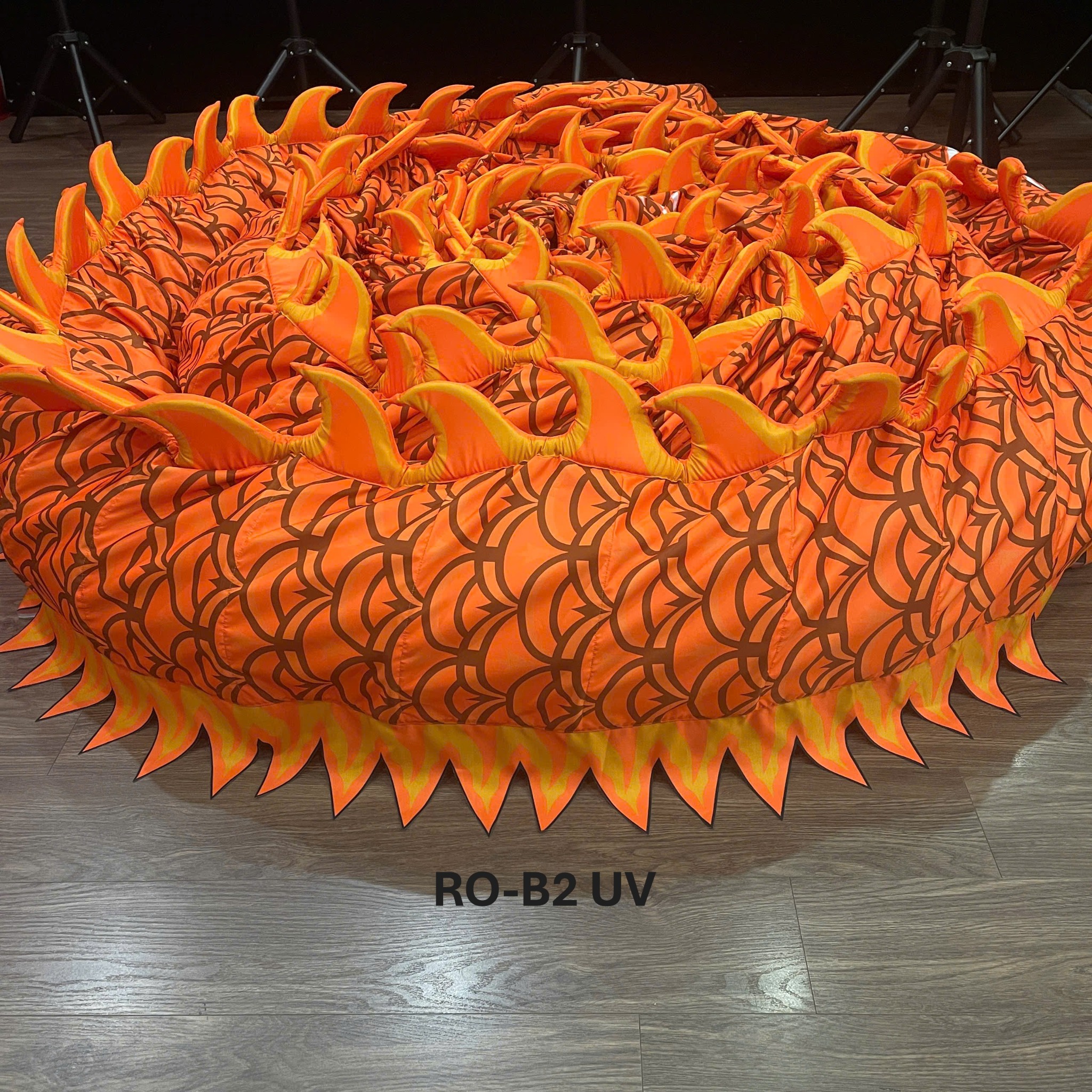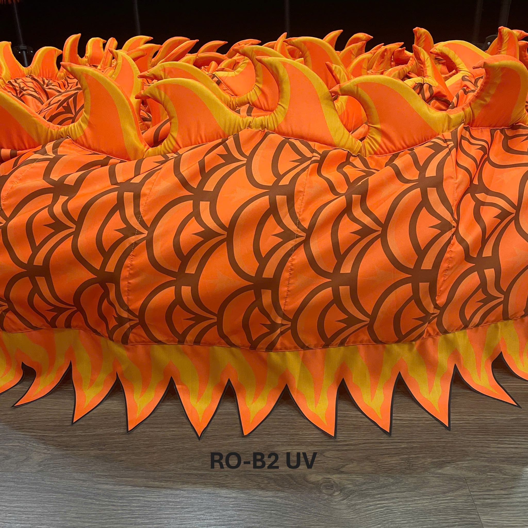 - Vây trên lưng rồng được làm bằng vải bọc bên ngoài, bên trong là lớp mút xốp dày, tạo độ nổi và mềm mại khi chuyển động, đồng thời giúp rồng nổi bật hơn dưới ánh sáng sân khấu.