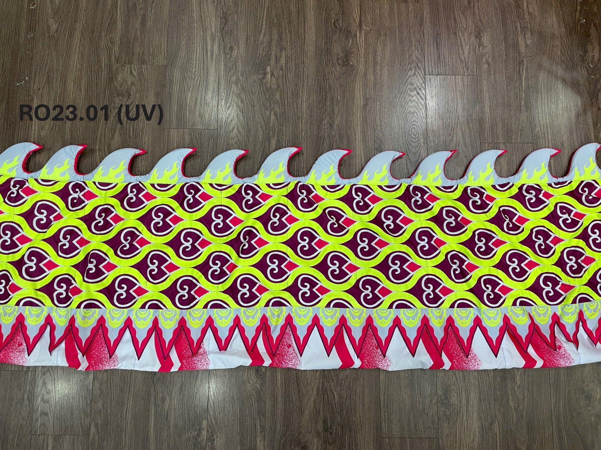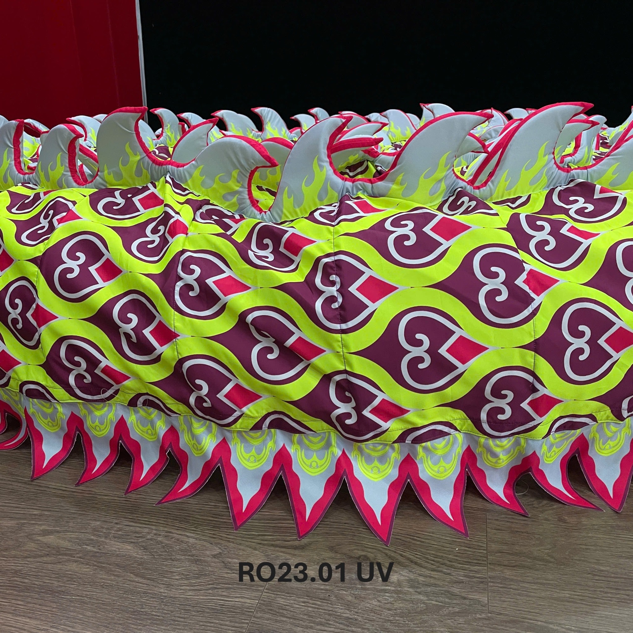 - Vây trên lưng rồng được làm bằng vải bọc bên ngoài, bên trong là lớp mút xốp dày, tạo độ nổi và mềm mại khi chuyển động, đồng thời giúp rồng nổi bật hơn dưới ánh sáng sân khấu.