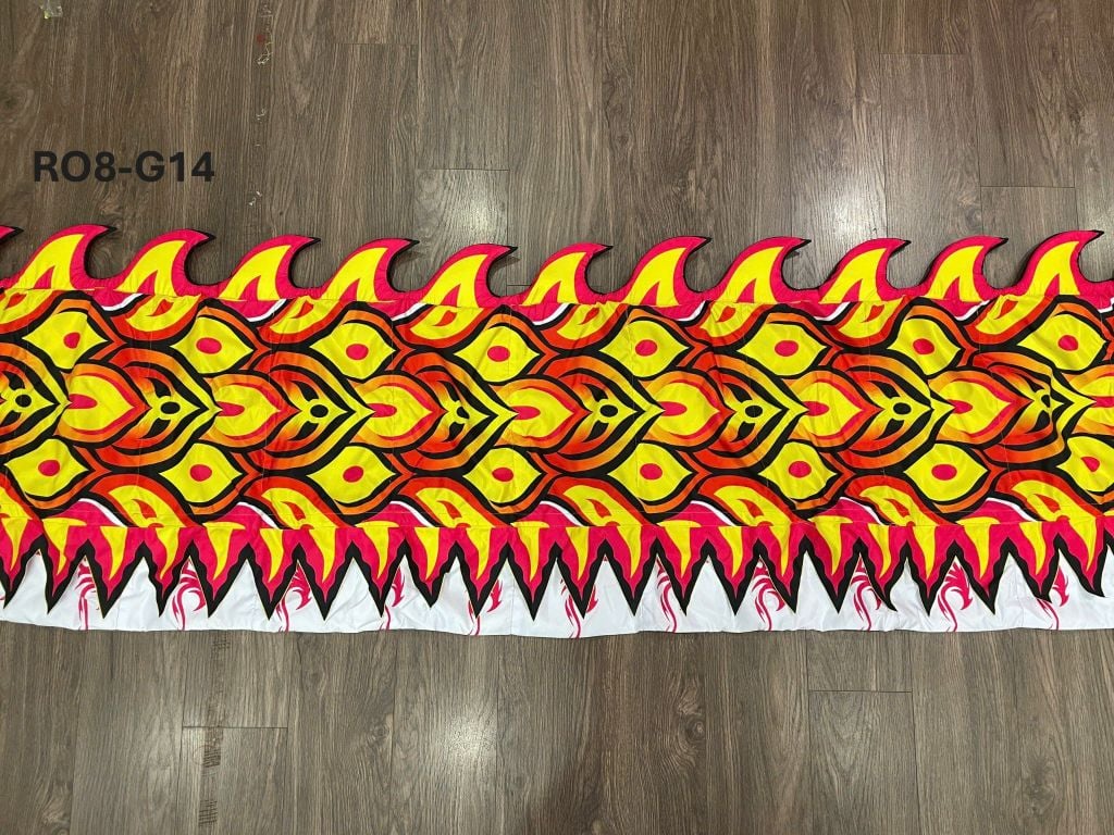 • Vây trên lưng rồng được làm bằng vải bọc bên ngoài, bên trong là lớp mút xốp dày, tạo độ nổi và mềm mại khi chuyển động, đồng thời giúp rồng nổi bật hơn dưới ánh sáng sân khấu.