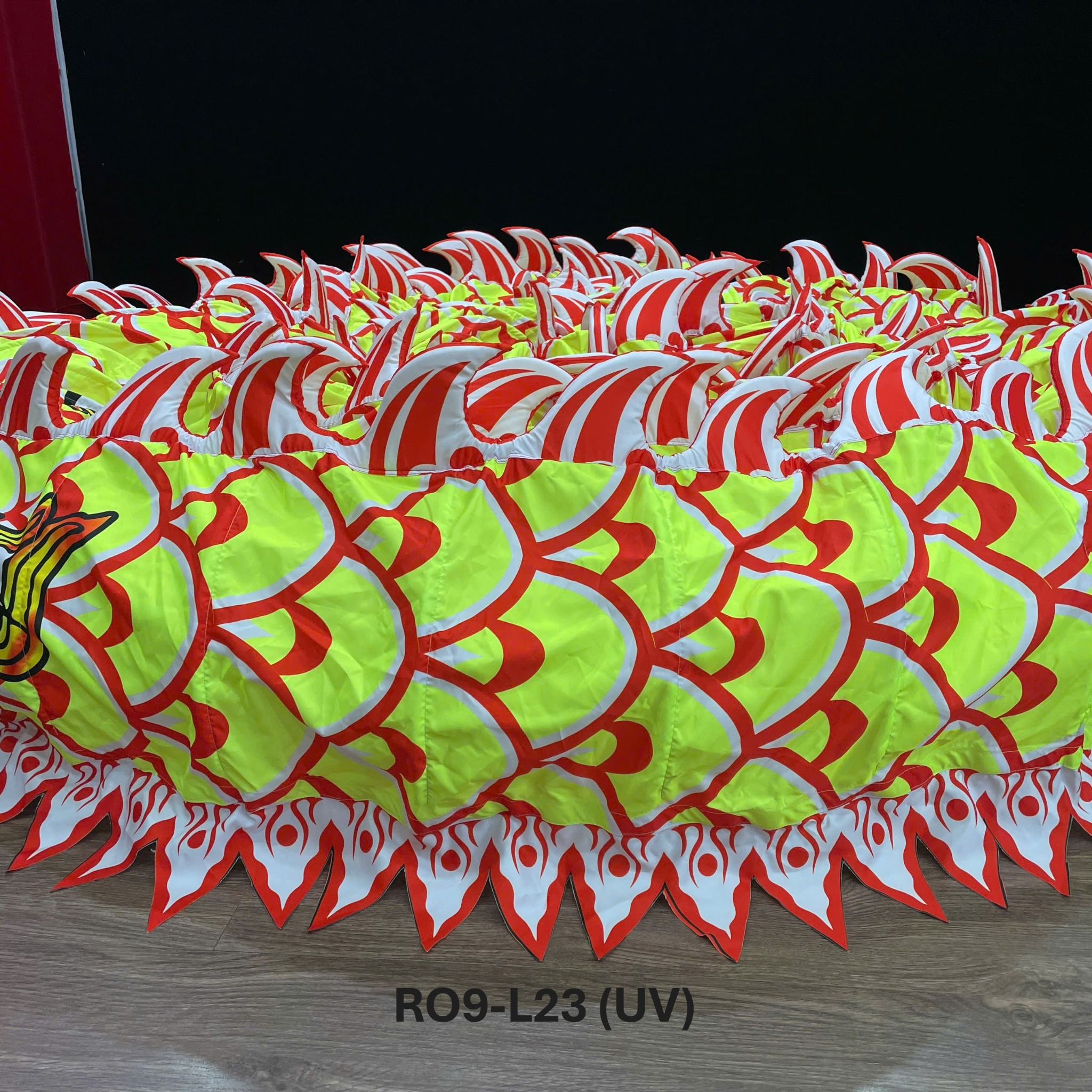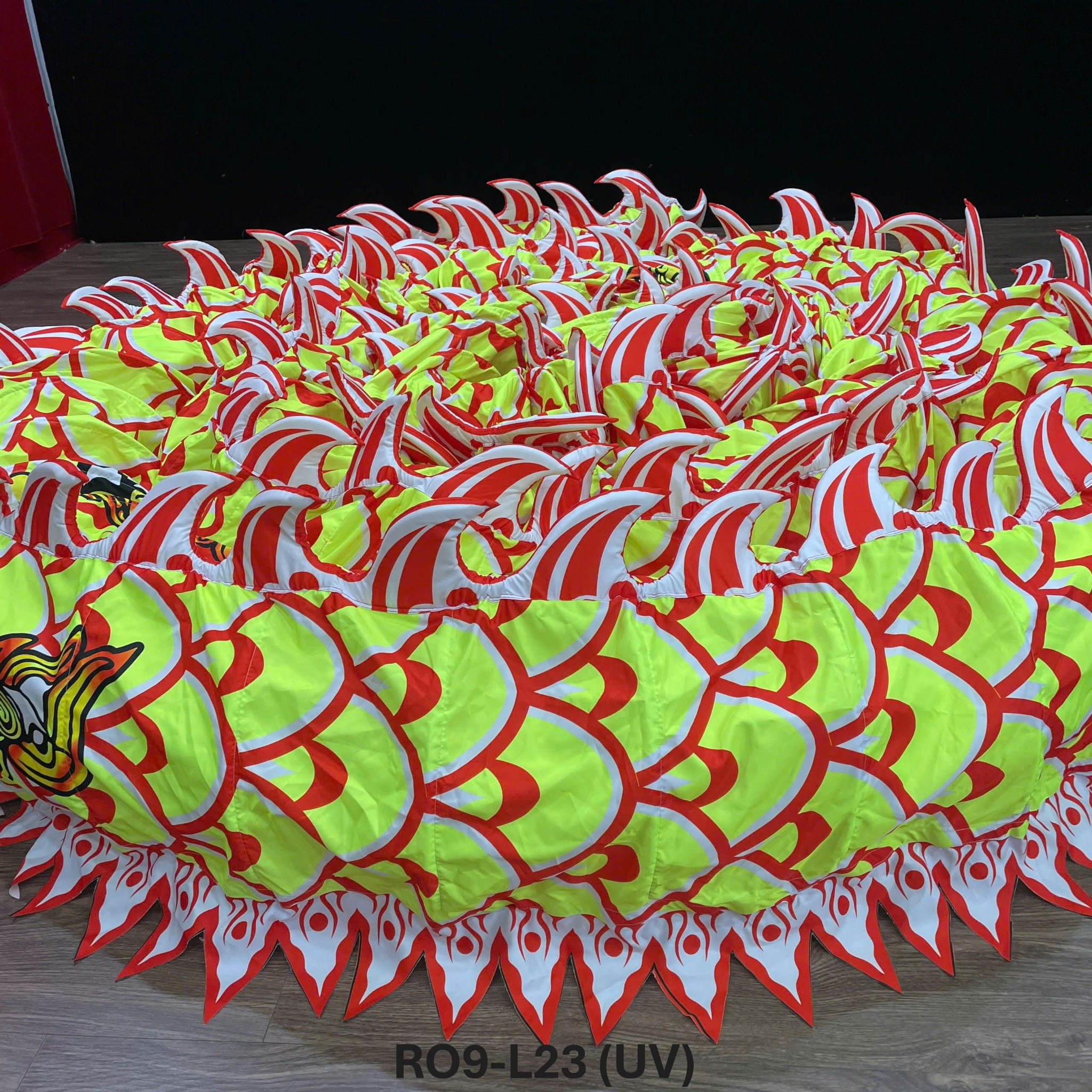 - Vây trên lưng rồng được làm bằng vải bọc bên ngoài, bên trong là lớp mút xốp dày, tạo độ nổi và mềm mại khi chuyển động, đồng thời giúp rồng nổi bật hơn dưới ánh sáng sân khấu.