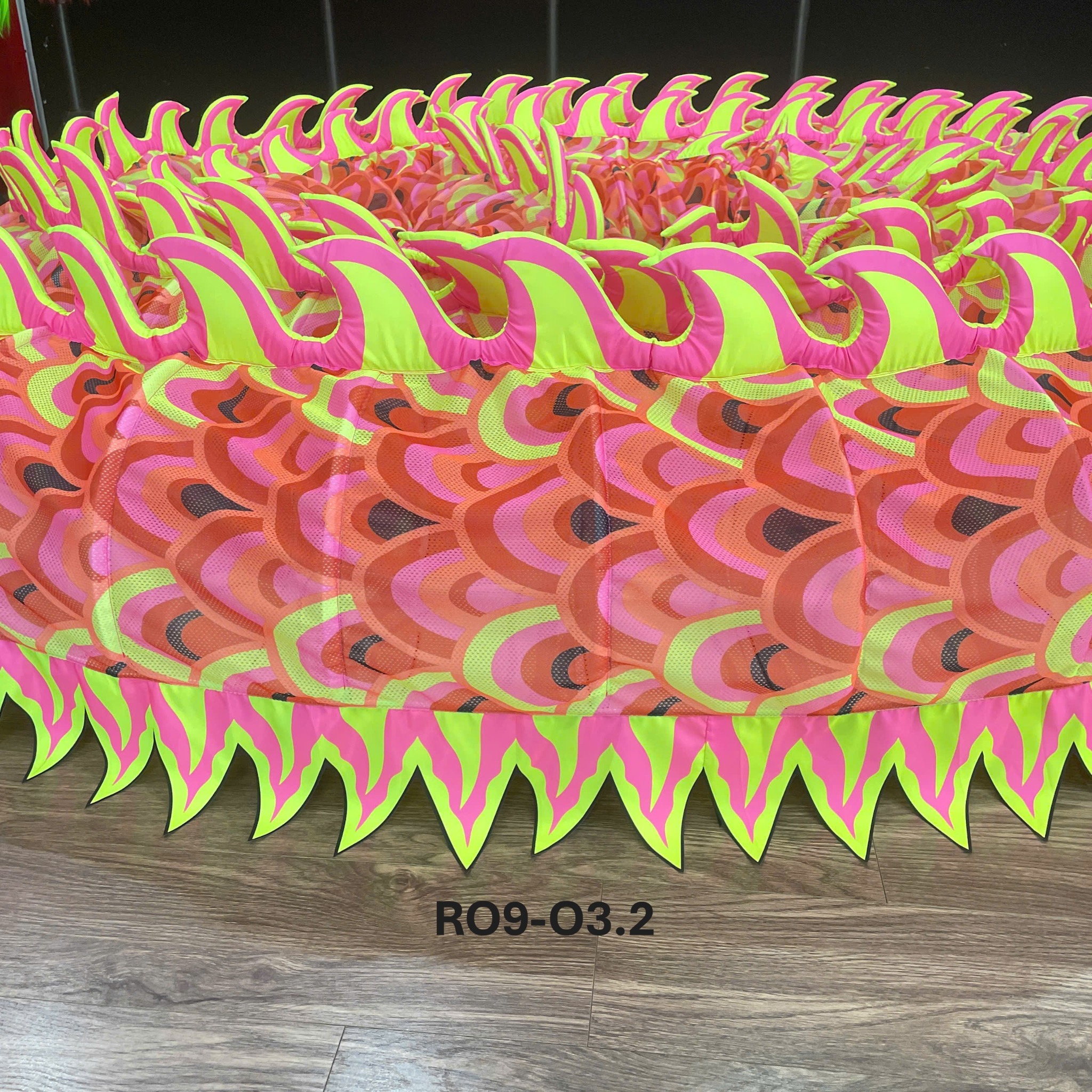 - Vây trên lưng rồng được làm bằng vải bọc bên ngoài, bên trong là lớp mút xốp dày, tạo độ nổi và mềm mại khi chuyển động, đồng thời giúp rồng nổi bật hơn dưới ánh sáng sân khấu.
